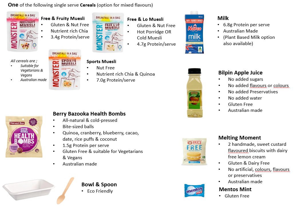 The continental breakfast pack includes a wholesome single serve cereal Fruit Muesli, creamy Milk, refreshing clear Australian Apple Juice, nutritious Fruit Health Balls, a decadent melting moment biscuit, a fresh Mentos Mint with a bowl and spoon competing the pack.
