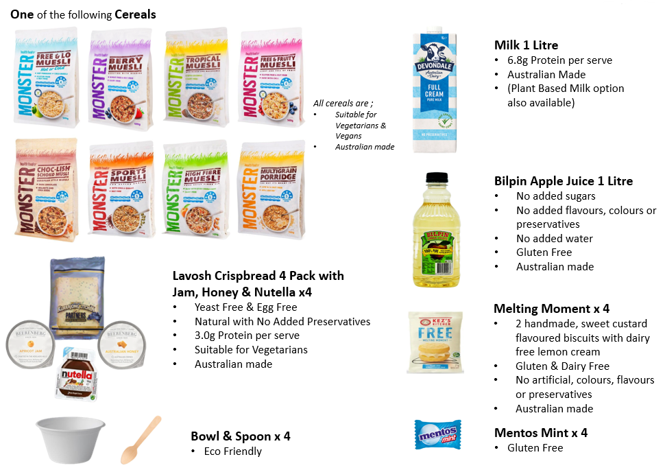 It includes a variety of Australian-made items, Fruit Muesli, creamy Milk, refreshing Apple Juice, a decadent melting moment biscuit, and crispy Lavosh Crispbread. It also comes with single-serve portions of Jam, Honey, and Nutella, plus refreshing Mentos mints.